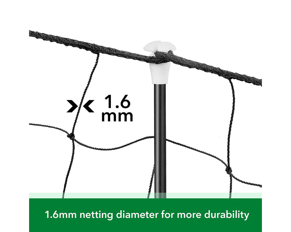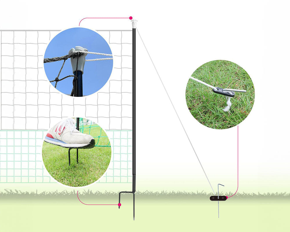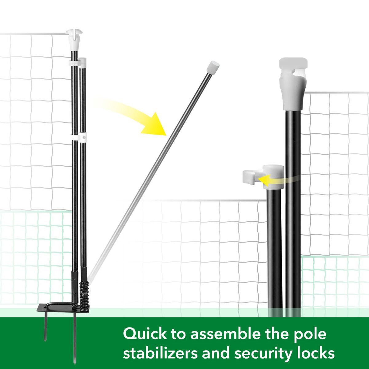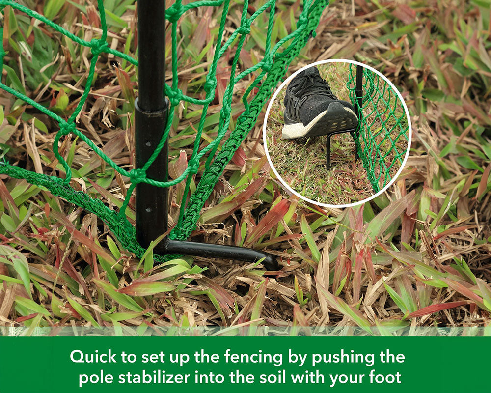 Quick Setup: Easily assembles with pole stabilizers and secure locks. Ground hooks anchor the netting for added stability.