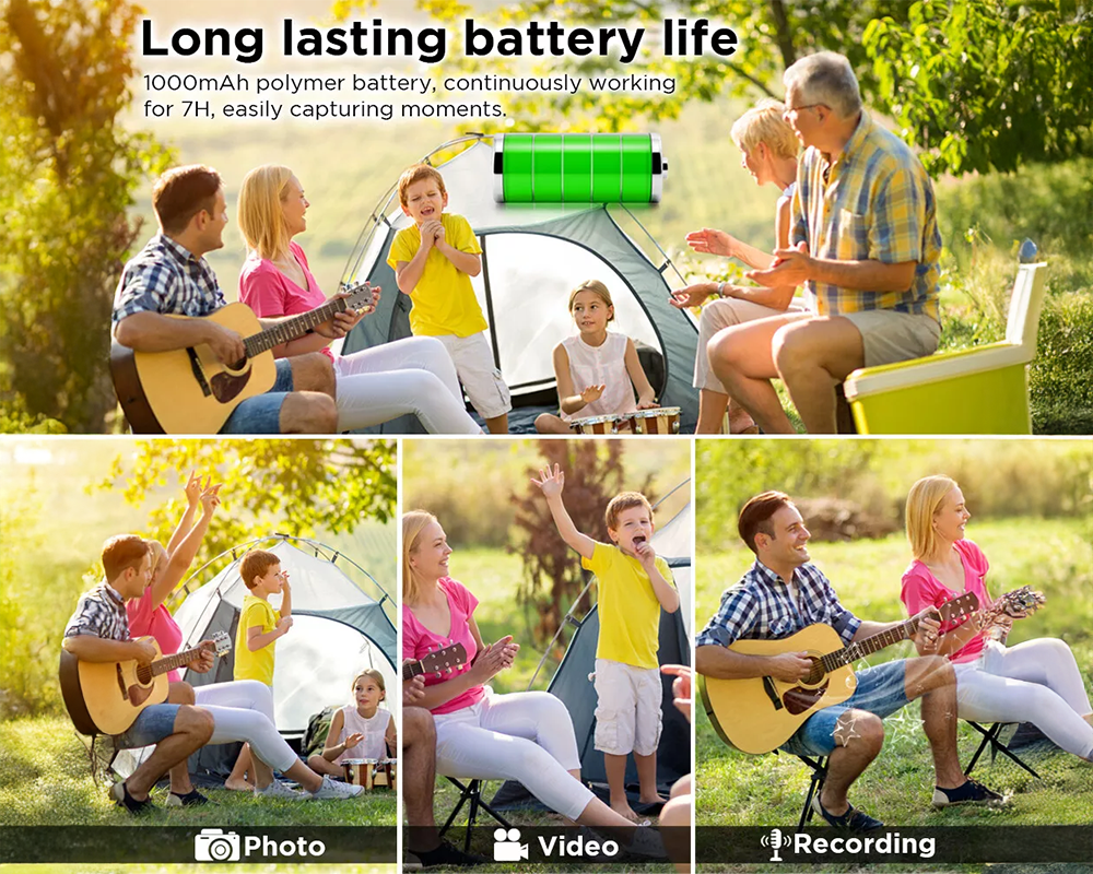 - Long Battery Life: 1000mAh rechargeable battery supports up to 8 hours of continuous recording.
