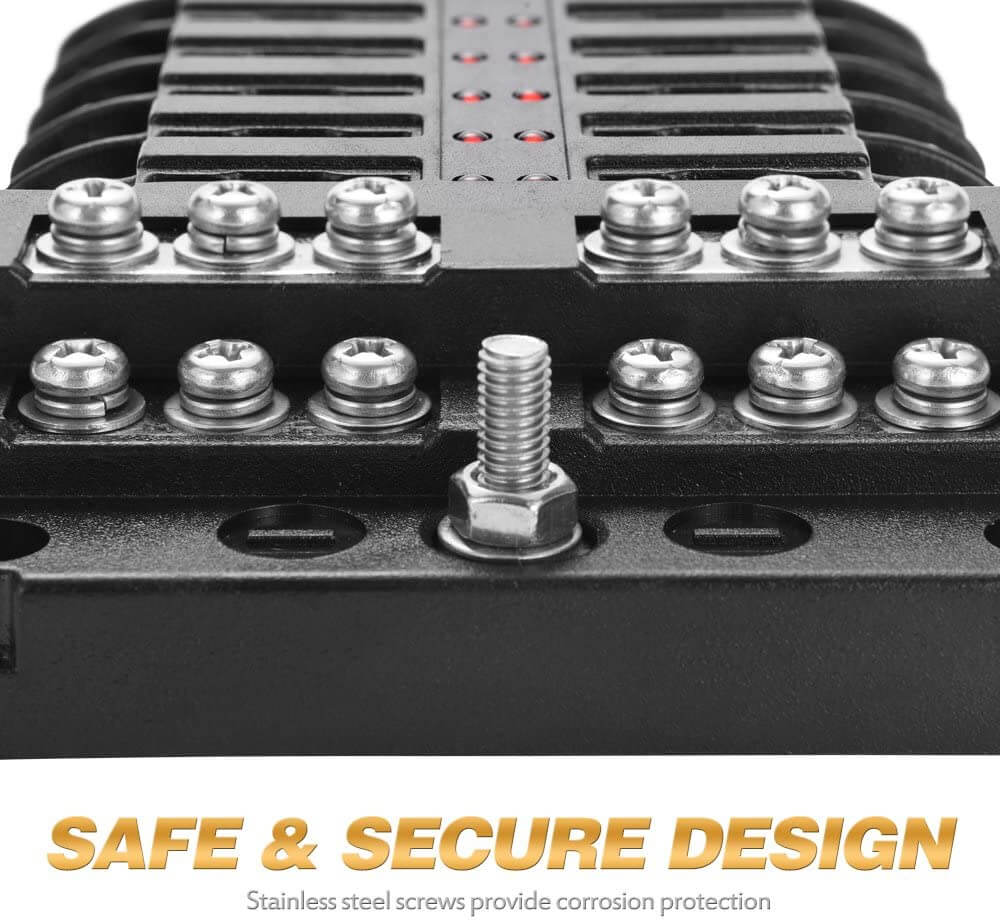 - Safe & Secure Design: Easily install the fuse block with four pre-molded holes. Marine-grade stainless steel input and output screws provide high anti-corrosion performance, ensuring long-term durability.