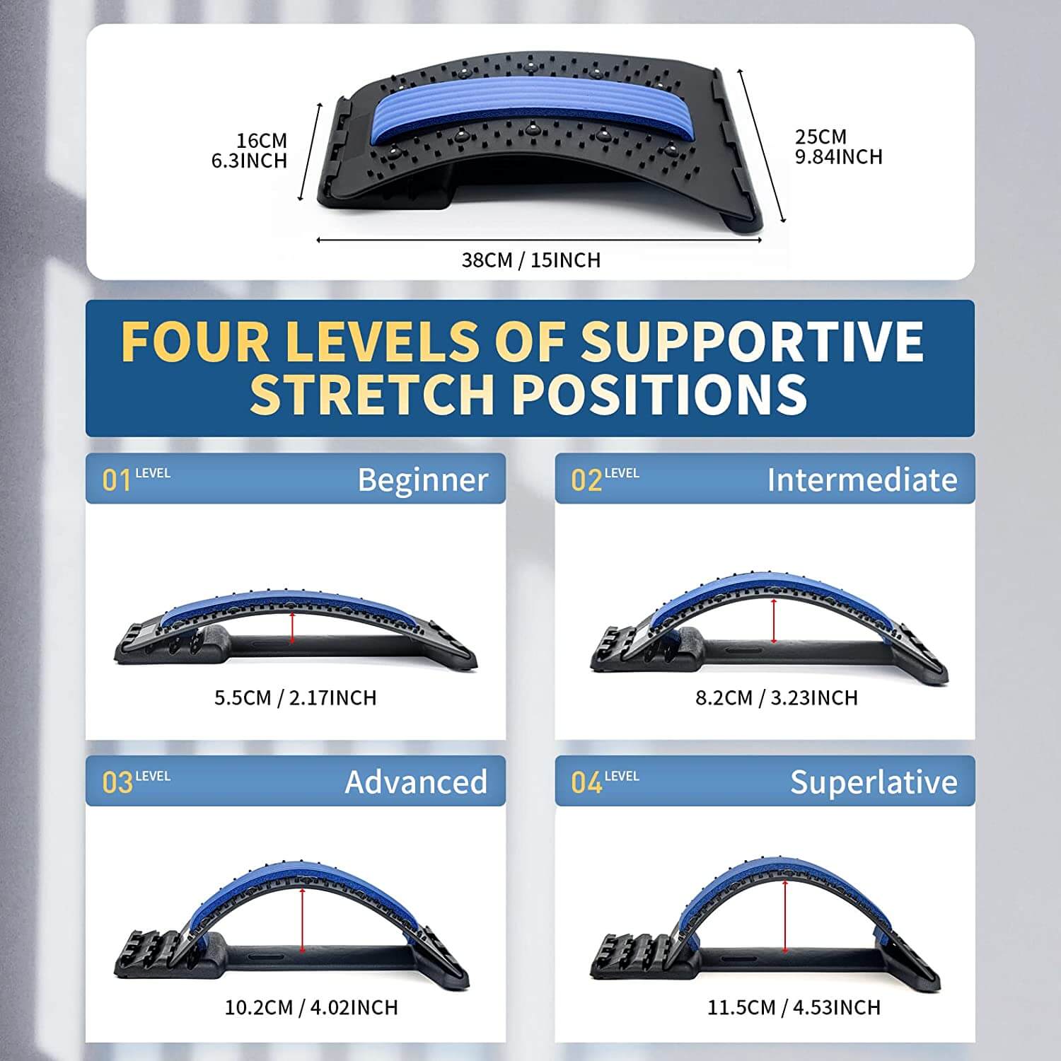 Relieve lower and upper back pain with the ADINOR 4-Level Back Stretcher. Designed to improve muscle pain and pressure symptoms, it supports up to 300 pounds without deformation. Featuring upgraded thickened spine protection pads and seat belts for maximum comfort and stability, it's ideal for use at home, in the gym, in the car, or in an office chair.