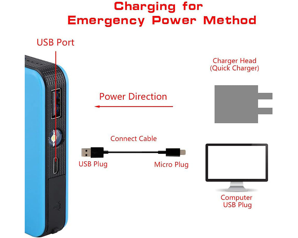 - Emergency Jump Starter: Easily jump-starts 12V vehicles with a starting current of 200A and a peak current of 400A.