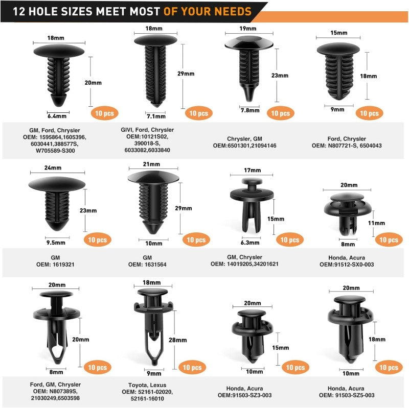- 12 Most Popular Sizes: Featuring 12 of the most common clip sizes, this set is compatible with various car models, including GM, Chrysler, Ford, Toyota, Nissan, Mazda, Hyundai, Kia, AMC, Jeep, and more.