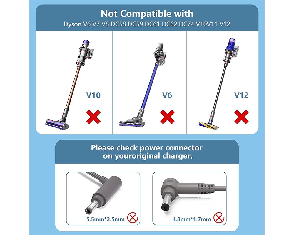 - Not compatible with V6, V7, V8, DC58, DC59, DC61, DC62, SV03-SV06, V10, V11, V12, SV12, SV20, SV22, and does not support Type B batteries.