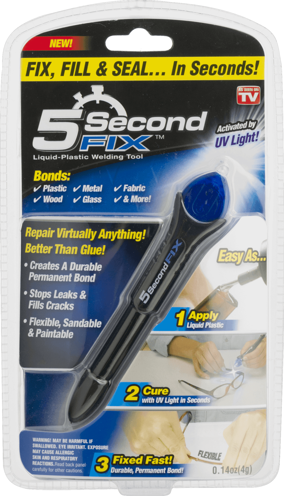 The 5 Second Fix Liquid Plastic Welding Tool is your solution for quick repairs around the home. Fix Adhesive Glue 5 Second With its special liquid-plastic formula, it instantly cures when activated by the UV light included in the package. This innovative tool bonds plastic, metal, fabric, wood, glass, rubber, tile, acrylic, PVC, ceramic, leather, and vinyl. Better than glue, it creates a durable Fix Adhesive Glue 5 Second permanent bond, stops leaks, and Fix Adhesive Glue 5 Second fills cracks, making it ideal for a wide range of repairs.