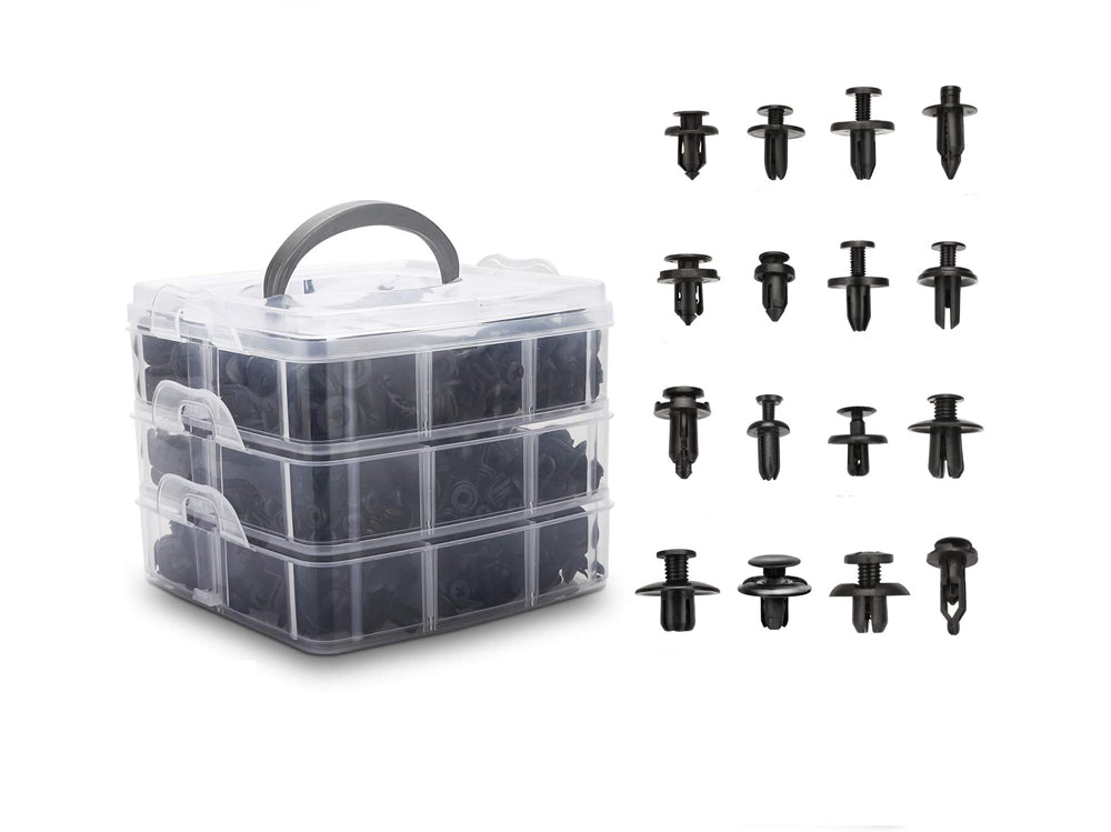 Replace broken or worn-out retainers with ease using our 620PCS Bumper Retainer Clips set. This kit includes 16 different sizes of push bumper fastener rivet clips, covering hole sizes from 6mm to 10mm. It's perfect for various automotive applications such as trim panel clips, door trim clips, door panel clips, bumper clips, fender clips, engine cover clips, and splash shield retainers.