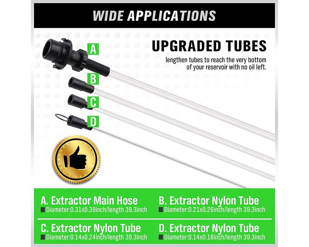 - Includes 5 extraction tubes with various diameters to reach the bottom of oil pans or reservoirs.