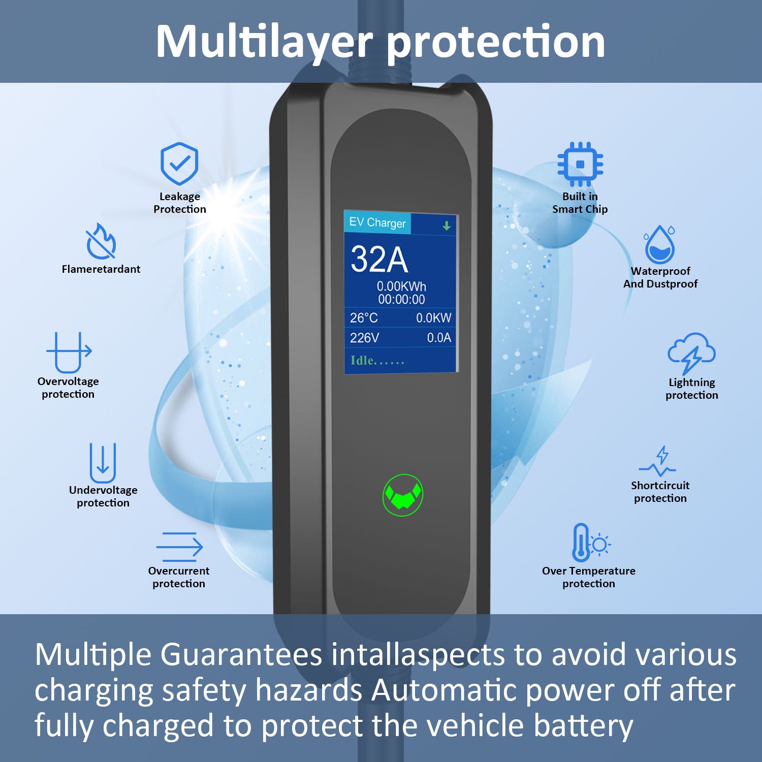 The LCD screen provides real-time data, and with the LED status indicators and adjustable current settings (8A-16A), monitoring and controlling your charge is hassle-free. -