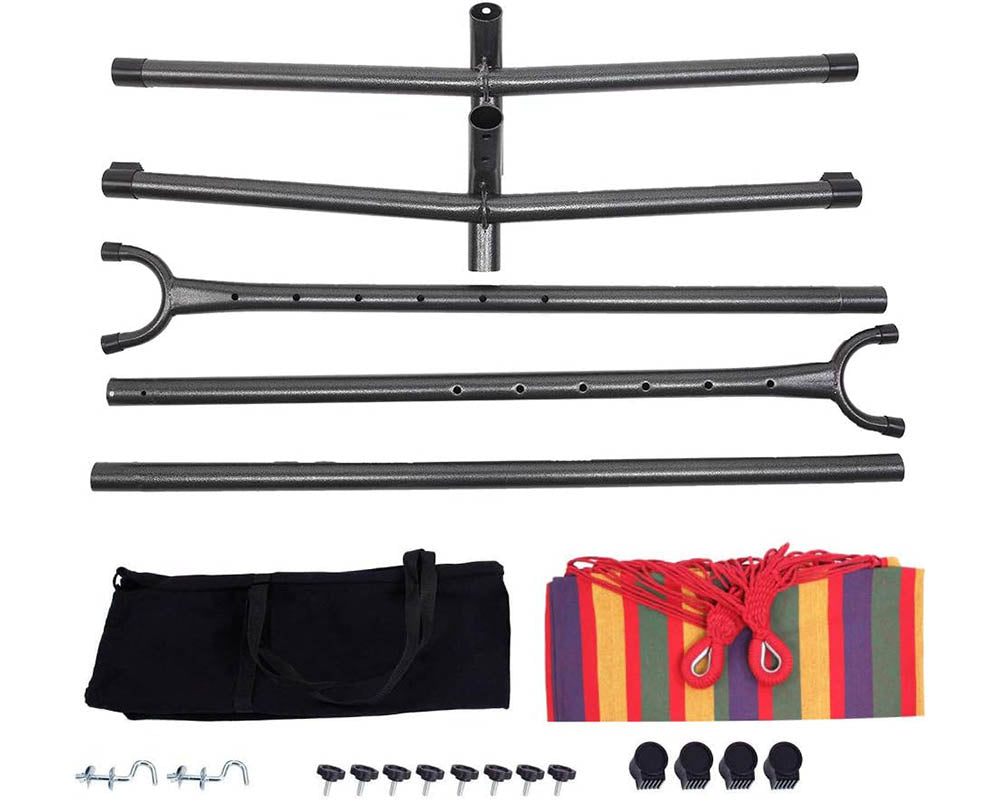 The universal 9 ft steel stand includes 6 evenly spaced holes, allowing you to adjust the hammock’s height for ultimate comfort. Whether you prefer a low, mid, or high position, you can easily adjust to your desired height. This stand accommodates string-style hammocks between 9 to 11.5 feet (274 to 350 cm).