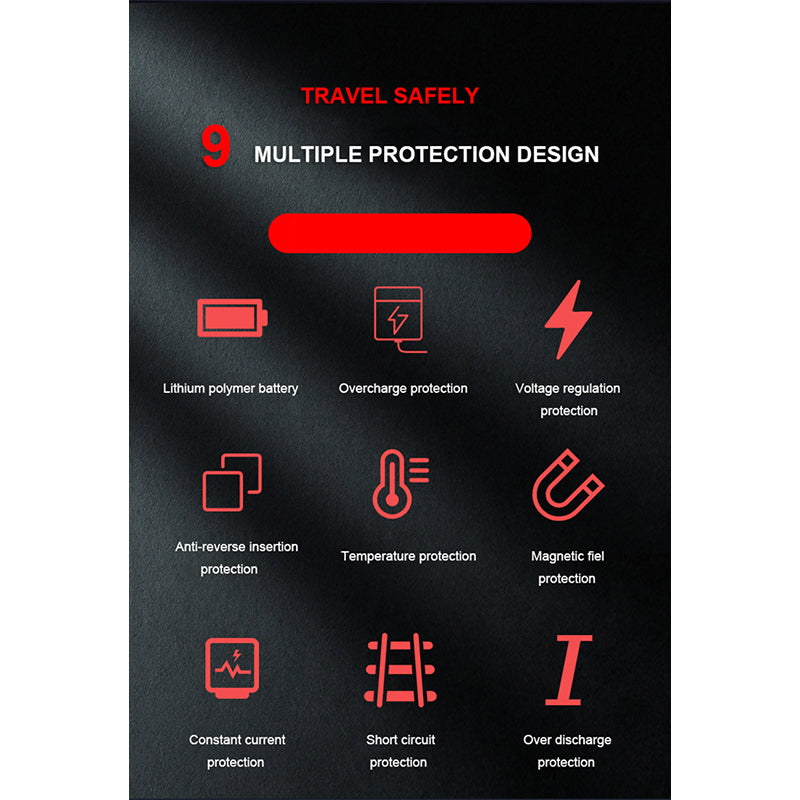 - over charge protection, over discharge protection, balance protection, magnetic field protection