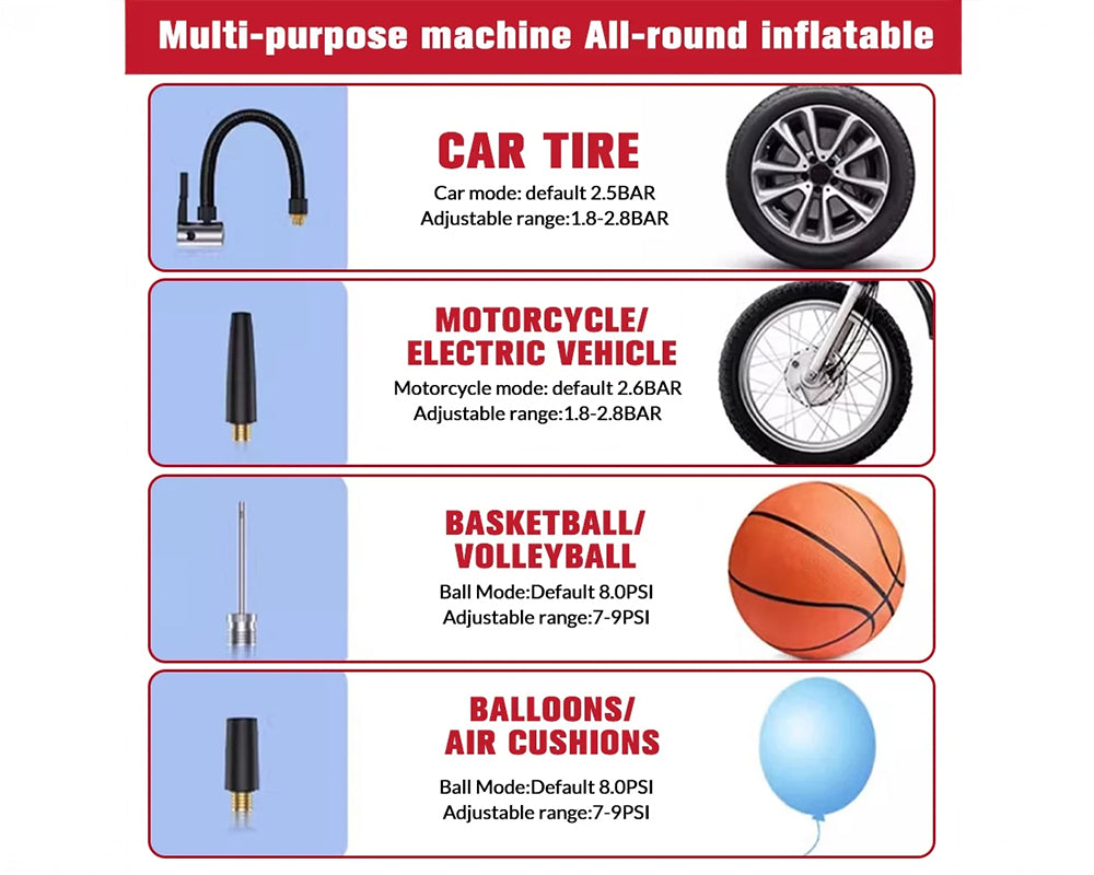 - Smart Tire Inflation: Easily inflate tires or sports equipment up to 150 PSI with presets for cars, motorcycles, bikes, and balls.