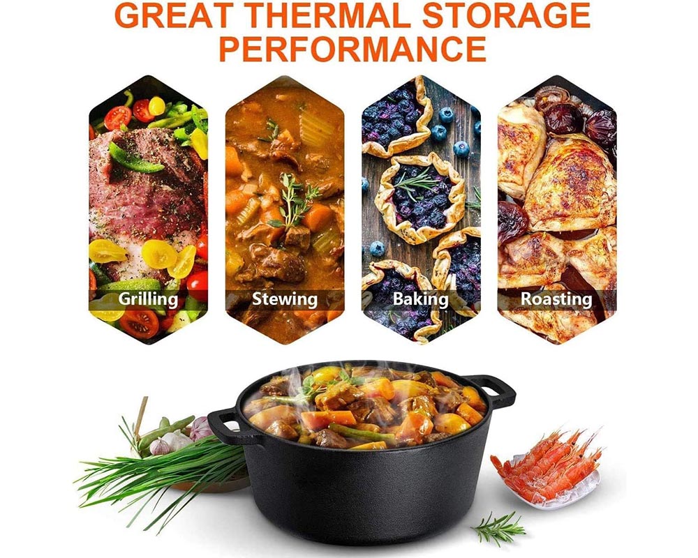 Cast Iron Dutch Oven with 2-in-1 Skillet Lid – 5 Quart Pot & 1.6 Quart Pan, Pre-Seasoned for Camping, BBQ, Home Cooking, and Baking