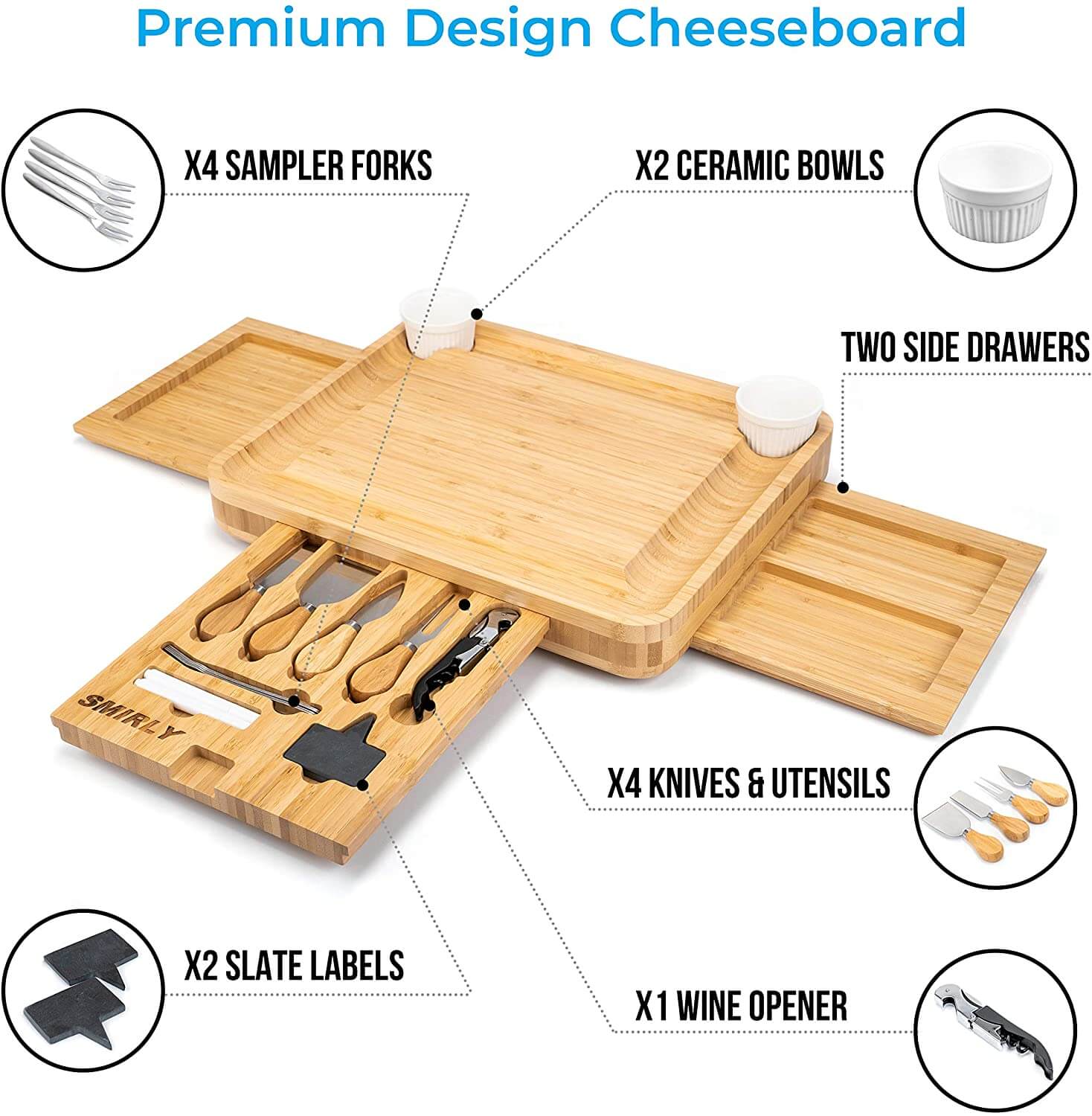 - Bamboo Party Plate: Extra-large wooden cheese and charcuterie board with 2 removable drawers for garnishes and cheese cutlery storage.