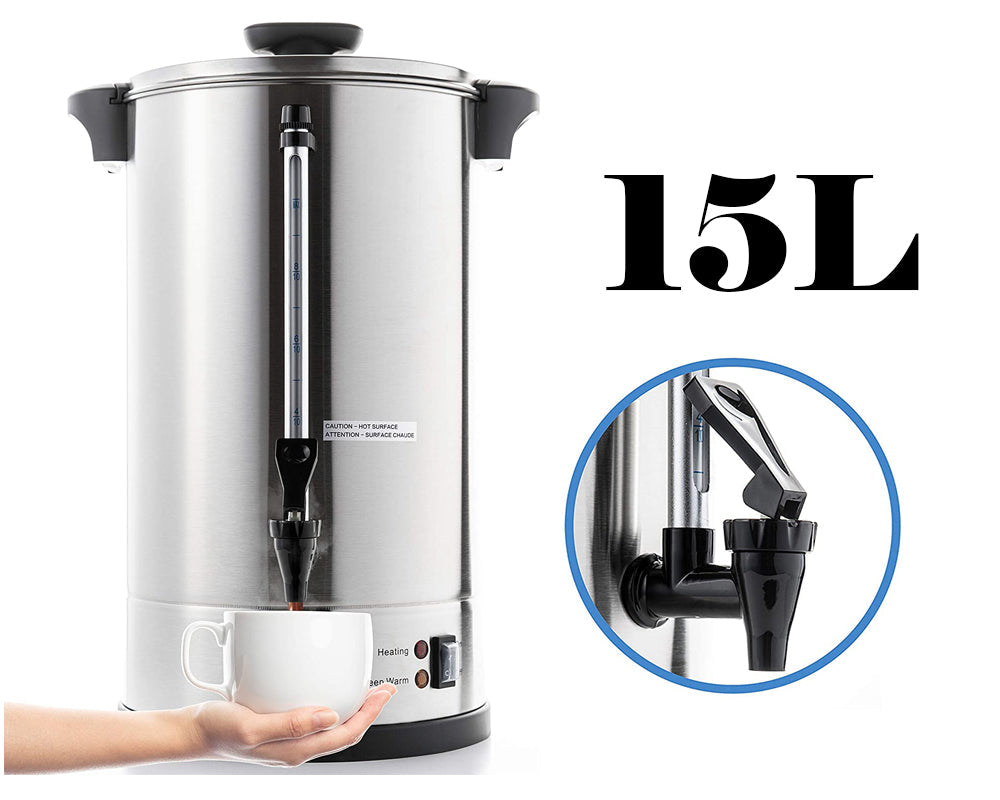 Experience the epitome of efficiency and capacity with the Commercial Grade Stainless Steel Percolate Coffee Maker Hot Water Urn. Designed for heavy-duty usage, this remarkable coffee maker brews an impressive 15 liters in just 40 minutes, making it the perfect companion for catering services, restaurants, churches, schools, healthcare facilities, offices, and shops.