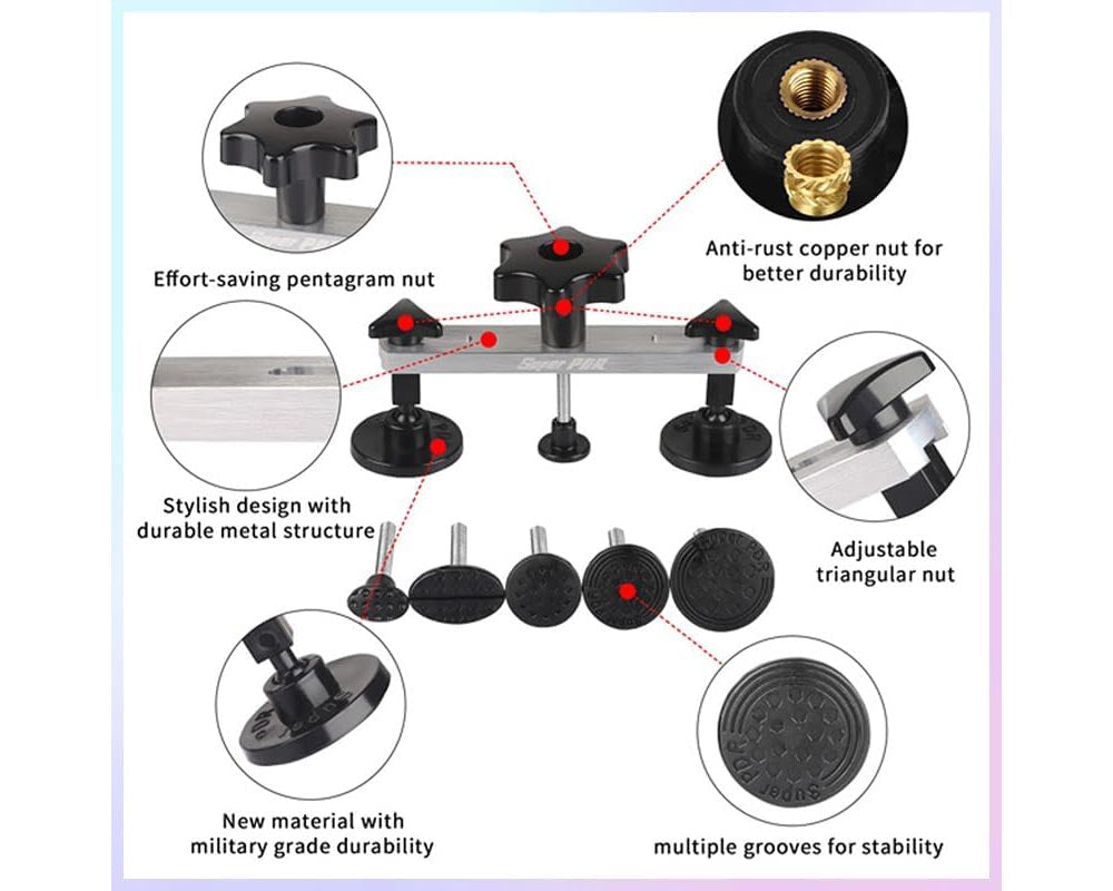 - Comes with a black lifter and adjustable bridge puller for various dent sizes, including large and small dents.