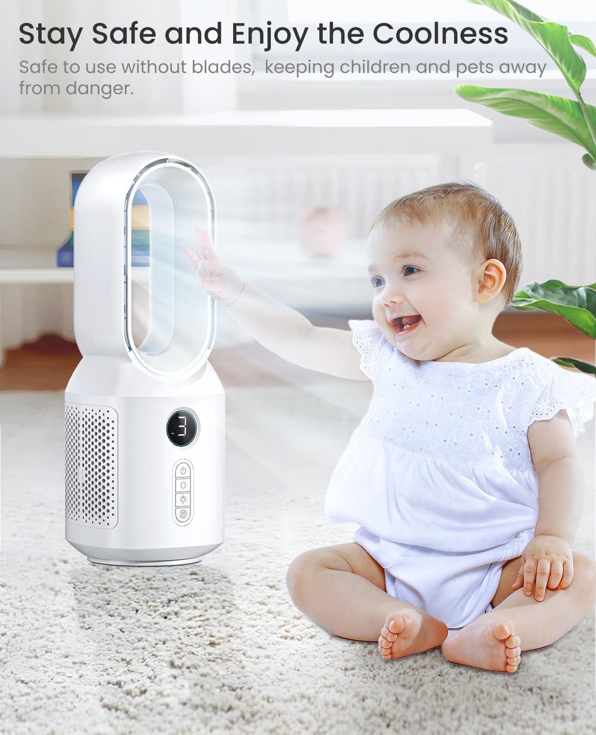 - Safe Bladeless Fan: This small fan features powerful airflow with extremely low noise, reducing dust accumulation and making it easy to clean. The bladeless design enhances safety, making it worry-free for households with children or pets.