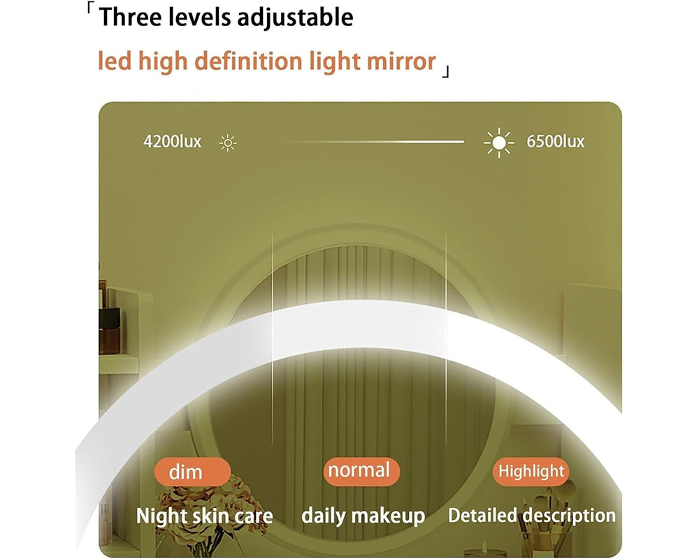 - LED Mirror with Adjustable Brightness: The built-in LED Mirror offers three lighting modes—dim, Dressing table medium, and bright—perfect for makeup, skincare, or nighttime routines.