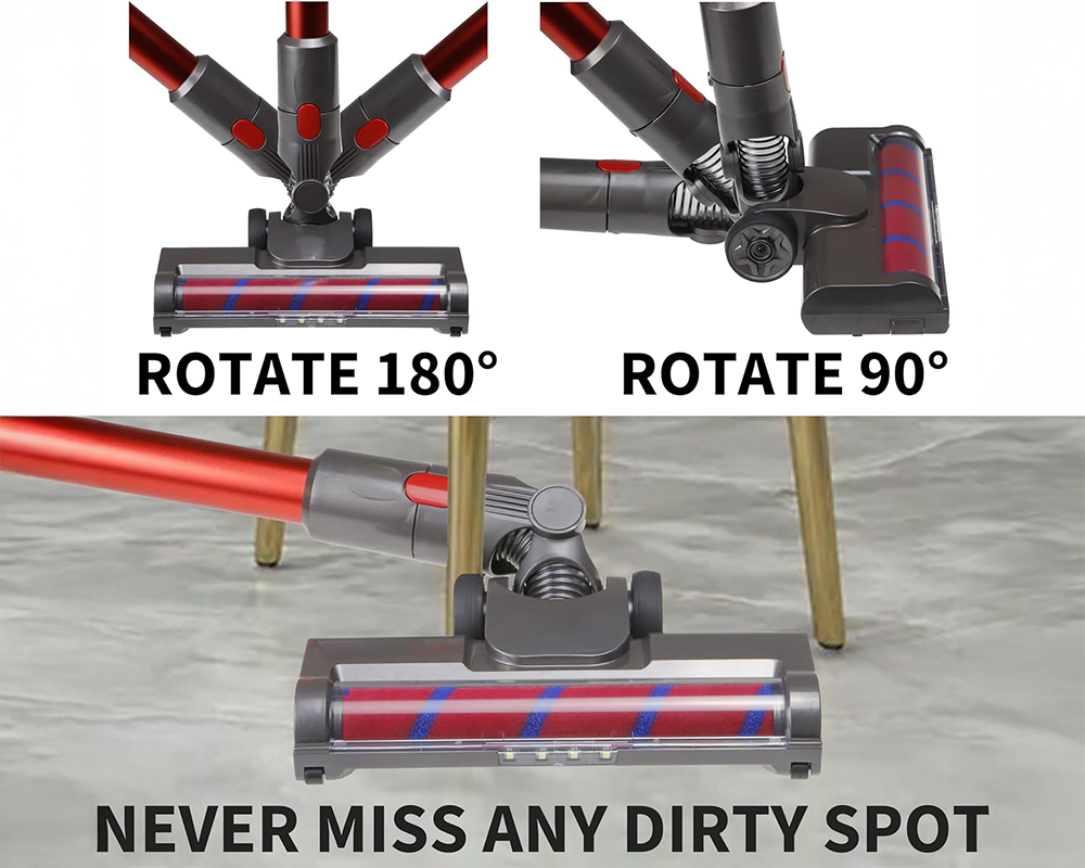 - 90° and 180° rotation on the Dyson Roller Brush allows flexible maneuvering in tight spaces.