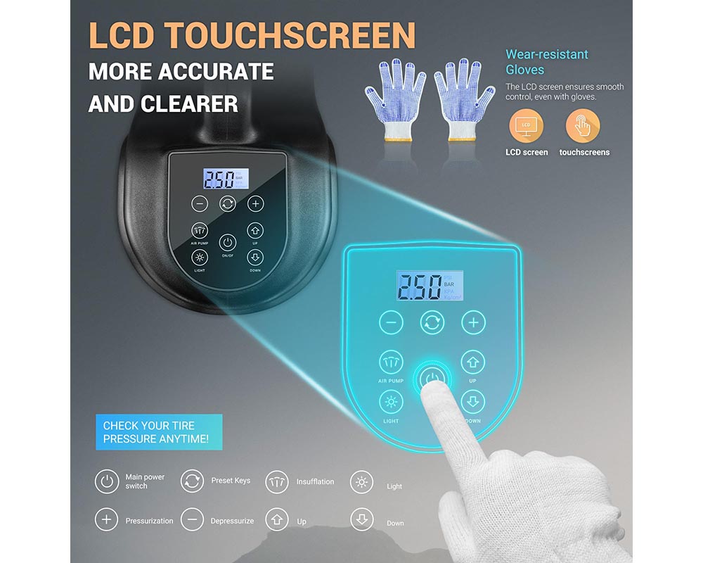 - This portable auto jack includes a built-in air pump for easy tire inflation. The digital LCD display helps monitor tire pressure, and you can preset target pressure to avoid overinflation.
