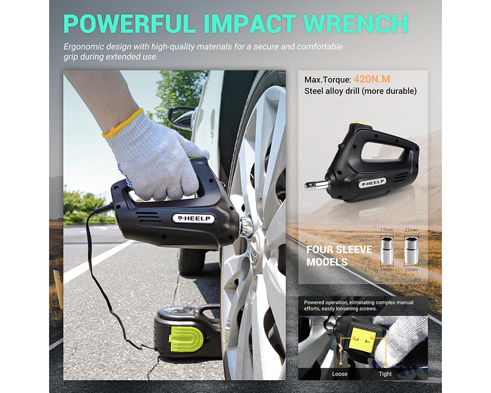 - Effortlessly remove nuts from car wheels with the high-torque impact wrench included in this kit. It features four different socket sizes, providing versatility for various vehicles. Ergonomic and efficient, it eliminates the need for manual labor during tire changes.
