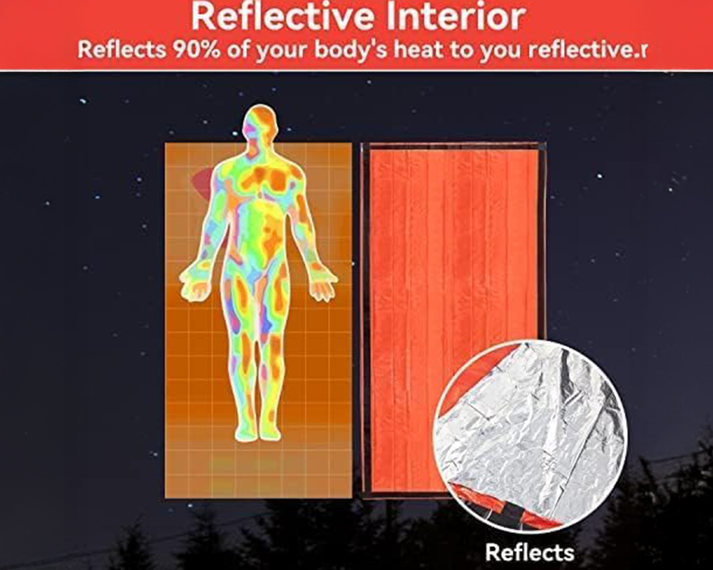 - Heat Retention: The Emergency Sleeping Bag reflects up to 90% of body heat to help prevent hypothermia and shock.