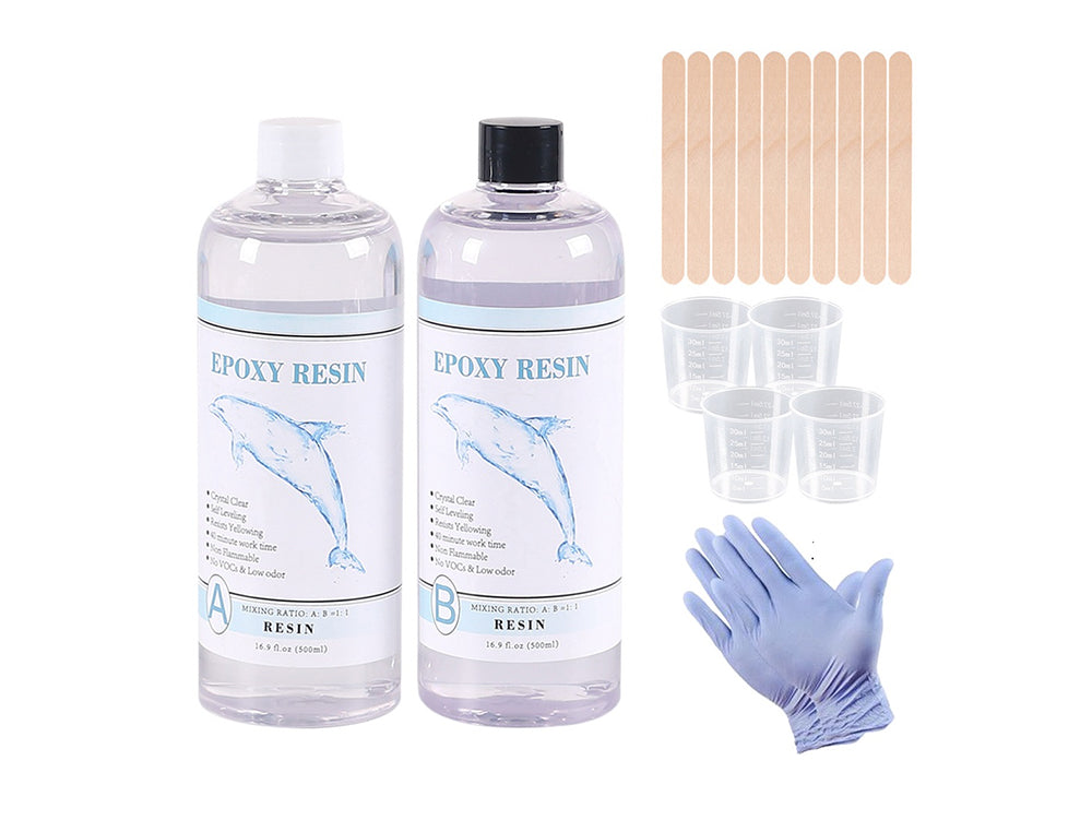 - 1:1 Ratio by Volume: This kit includes 16.9oz of epoxy resin and 16.9oz of epoxy hardener. Mixing is simple and smooth, making it perfect for both beginners and experienced artists. The kit also comes with 2 measuring cups, 4 sticks, Epoxy Resin and 1 pair of rubber gloves.
