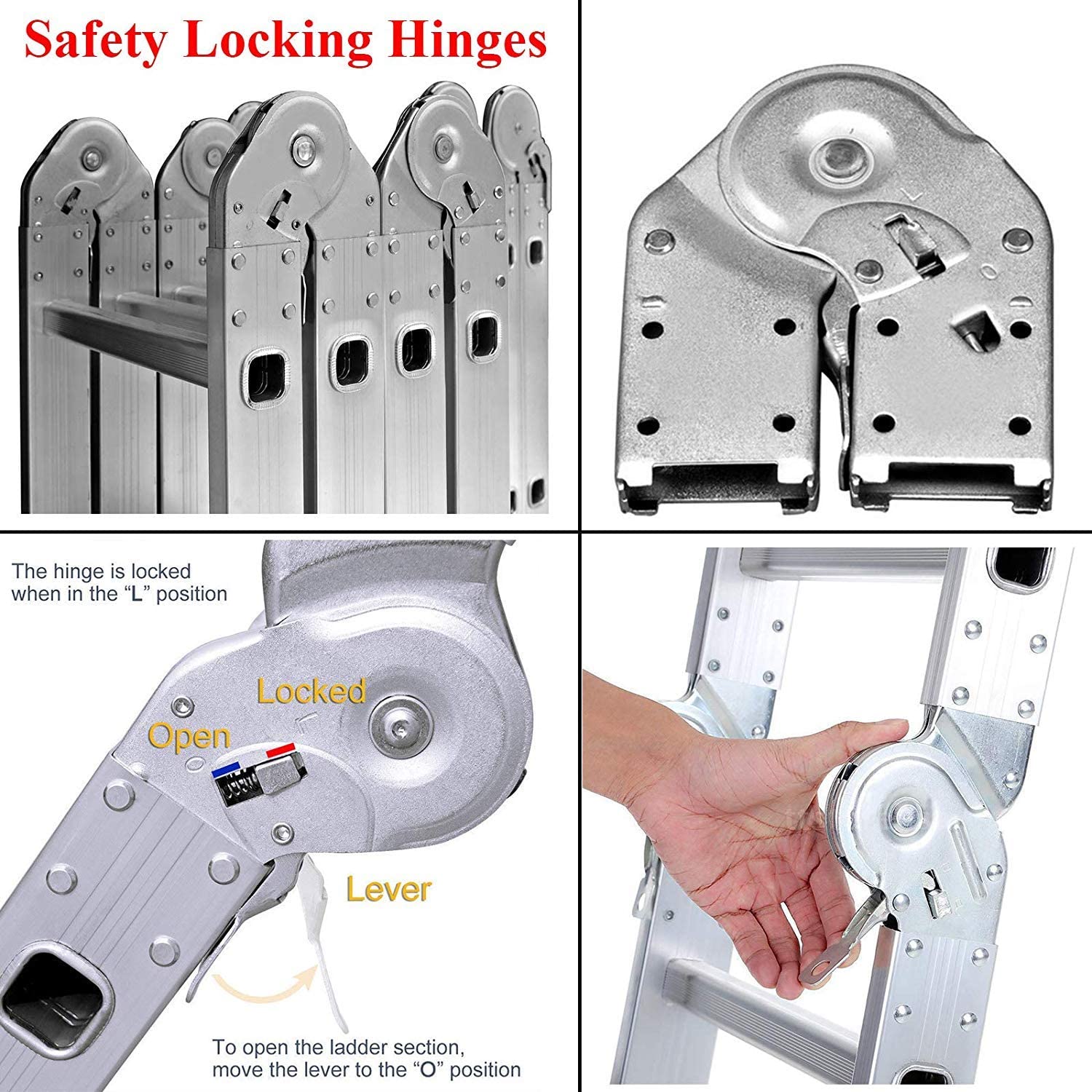 Multi-Position Safety Locking Hinges: Versatile design allows the ladder to be used as a straight ladder, step ladder, scaffold ladder, overhanging ladder, and stairwell scaffold ladder, making it adaptable for various situations.