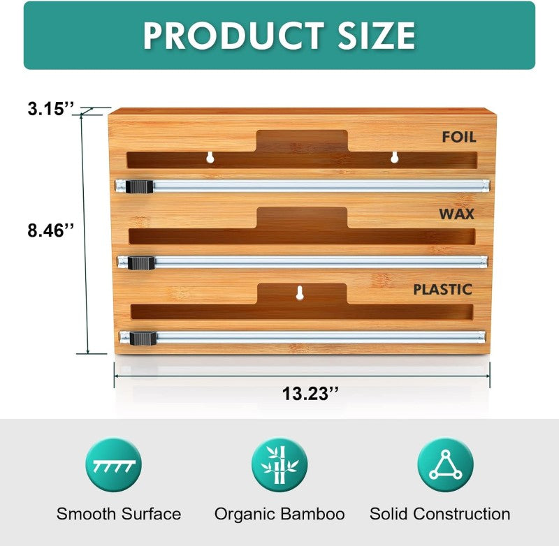 Introducing our 3-in-1 Wrap Dispenser with Cutter and Labels – Your Ultimate Kitchen Bamboo Organizer for Plastic Wrap, Aluminum Foil, and Wax Paper Rolls!
