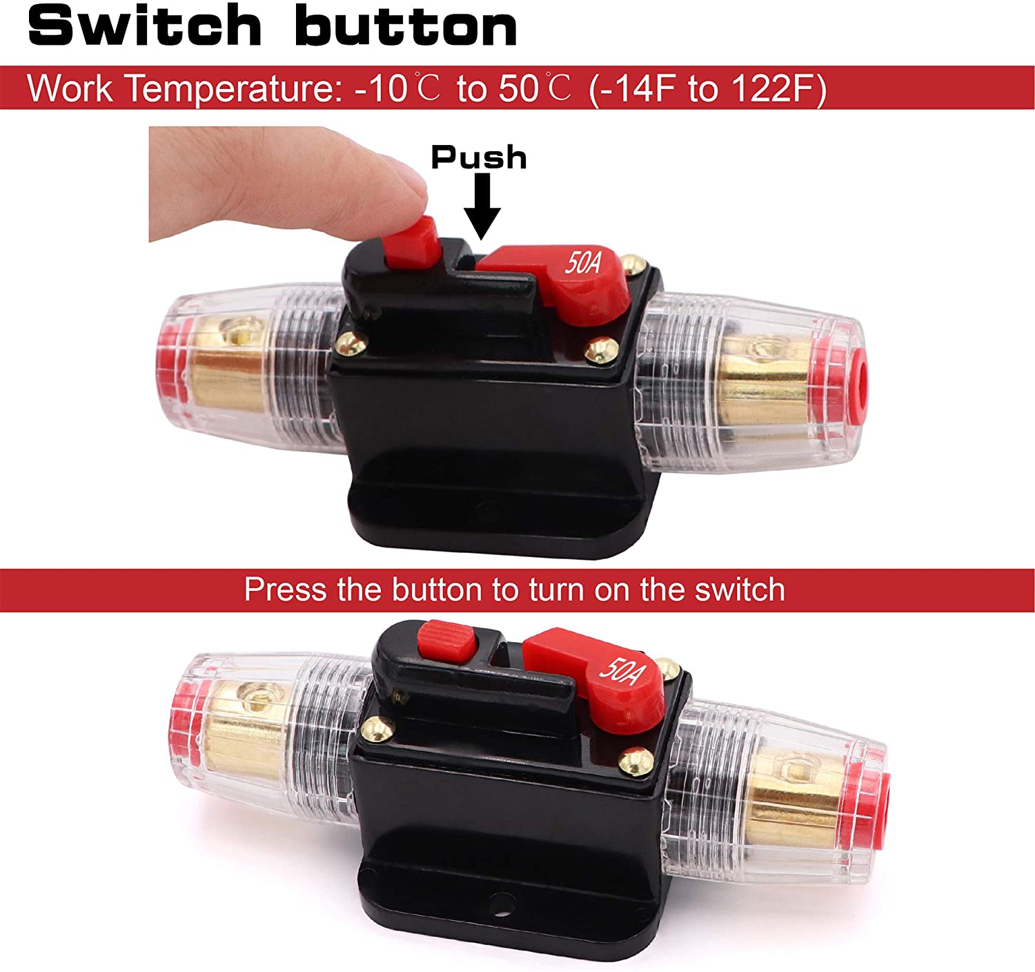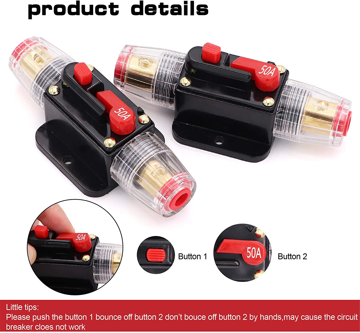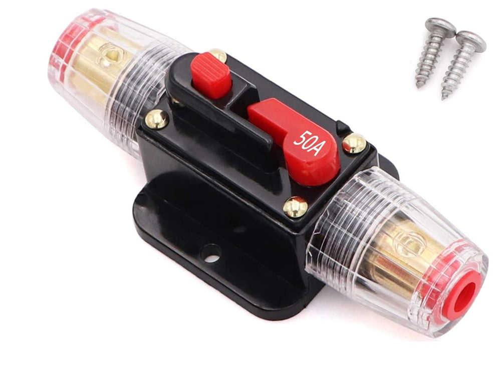 50 Amp Audio Inline Circuit Breaker Reset Fuse Holder 12V-24V DC with Manual Reset and Installation Screws for Car Audio, Stereo Switch and Solar Inverter System