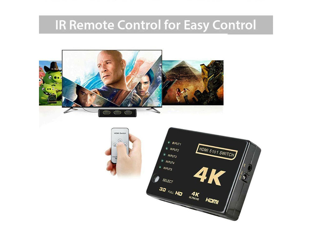 5-Port HDMI Splitter with Remote Control – 4K 3840x2160P HDMI Switcher, 1 in 5 HDMI Output for TV Box, PS3, DVD, PC