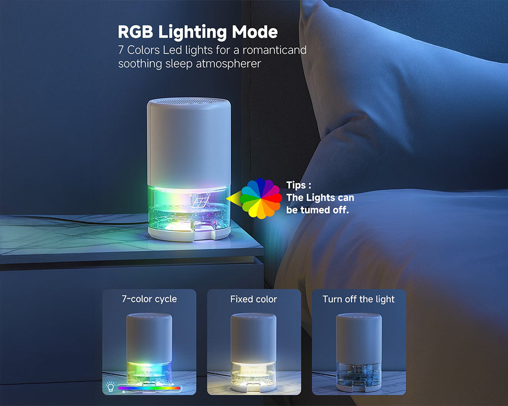- 7-Color LED Night Light: Create a calming atmosphere with the multi-color LED feature of this Portable Dehumidifier, ideal for night use.