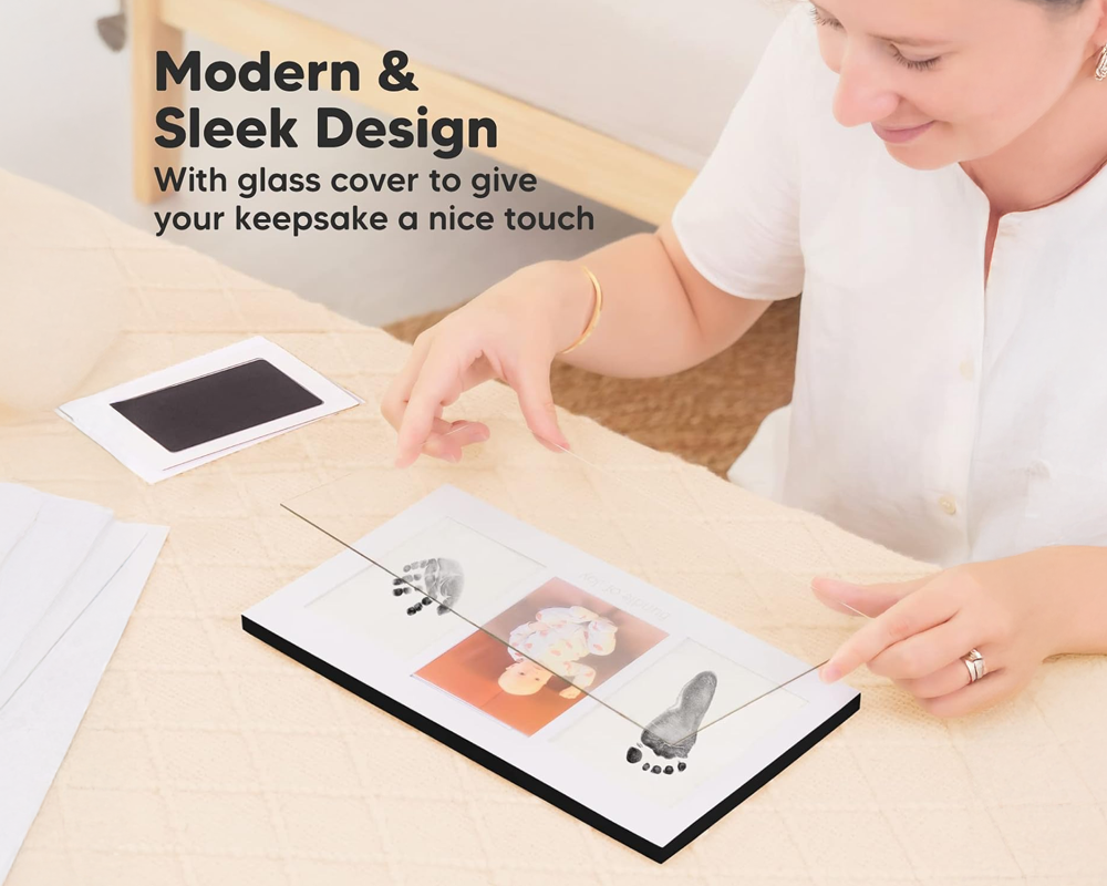 - Premium Quality Frame: Durable wooden frame with high-quality glass protects prints for years while complementing nursery décor. The Inkless Handprint Kit ensures memories remain clear and beautiful.
