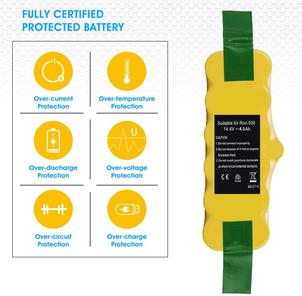 Upgrade your iRobot Roomba with this high-capacity 14.4V 4.5Ah replacement battery. Compatible with a wide range of models including 500, 600, 700, 800, and 900 series, it ensures extended runtime and reliable performance.