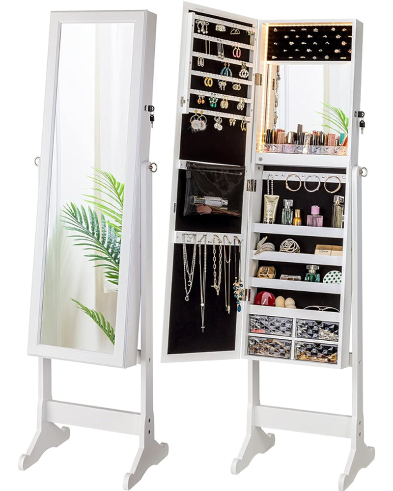 - A fusion of a stylish mirror and functional jewelry storage, offering both a full-length mirror and organized compartments for your accessories, jewelry, and cosmetics.