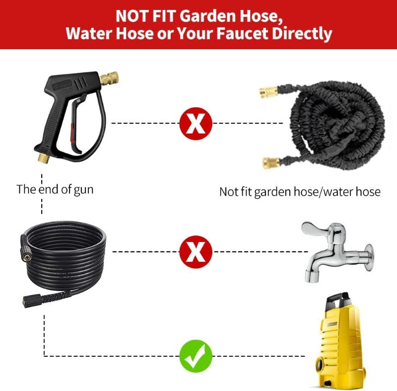 - IMPORTANT NOTICE: This gun assembly is not suitable for use with garden hoses, water hoses, or direct faucet connections. It is designed for high-pressure applications with a maximum pressure of up to 5000 PSI and a maximum flow rate of 7 GPM. The pressure washer gun features an M22 fitting and a 3/8" quick plug.