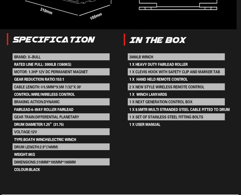 X-BULL Electric Winch 3000lbs/1360kg Wireless control X2 Steel Cable ATV UTV 12V
