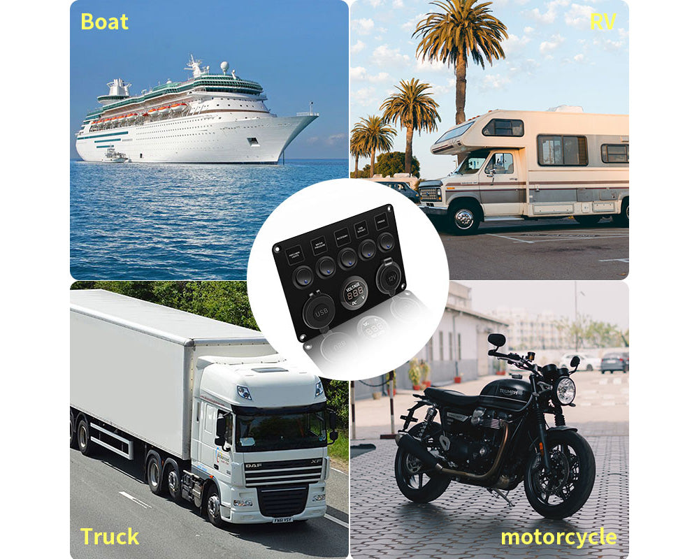 This versatile 5-gang switch panel is designed for easy control and monitoring in vehicles, boats, and other electrical setups. It features dual USB sockets, a voltmeter, a 12V power outlet, and 5 LED toggle switches. The switches are equipped with overload, over-current, and short circuit protection, making it a reliable addition to your vehicle or marine system.