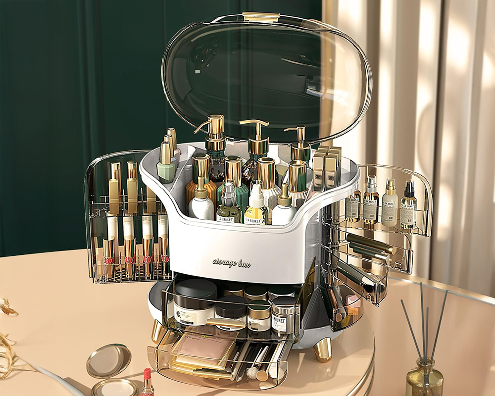 Keep your beauty essentials neatly arranged with this stylish Cosmetic Organizer. Featuring a dustproof lid and 90° rotatable drawers, this makeup storage box makes accessing your cosmetics, skincare, and tools effortless. Its layered design offers a large capacity, keeping everything organized, protected, and within reach. Perfect for bedroom or bathroom use, this Cosmetic Organizer combines functionality, convenience, and elegance.