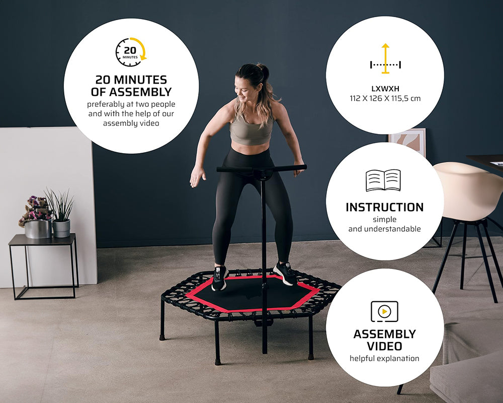 This 51-inch indoor trampoline is perfect for home fitness routines, offering a low-impact, effective workout that will help you stay in shape while avoiding strain on your joints. It’s the ideal piece of fitness equipment for small spaces, and its adjustable bar ensures you can customize the setup for your personal needs. Whether you're jumping for fun or performing strength training exercises, this trampoline will help you achieve your fitness goals with ease and comfort.