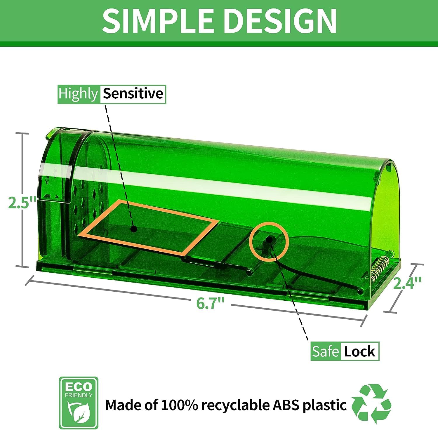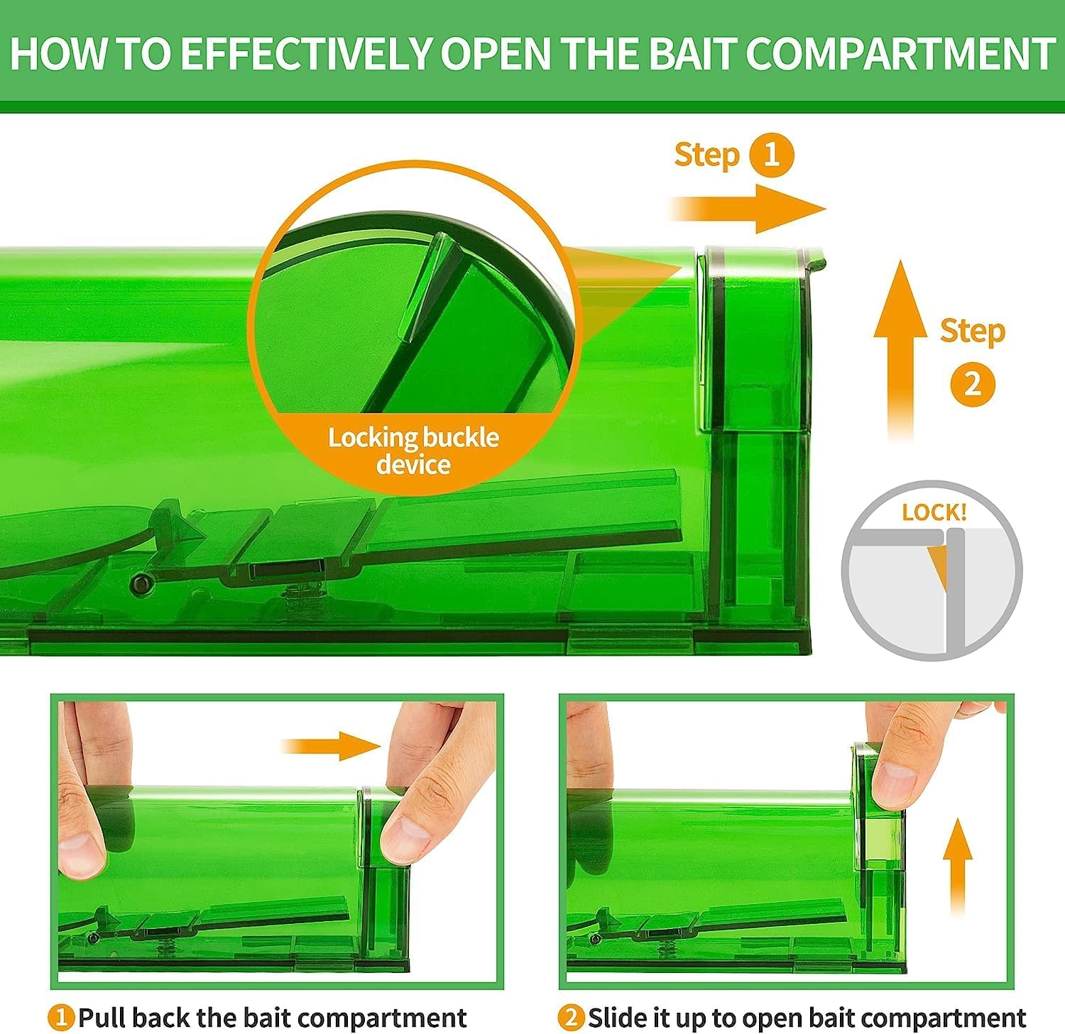 - Easy to use: Quick setup with bait compartment and lockable door; rear panel for easy release