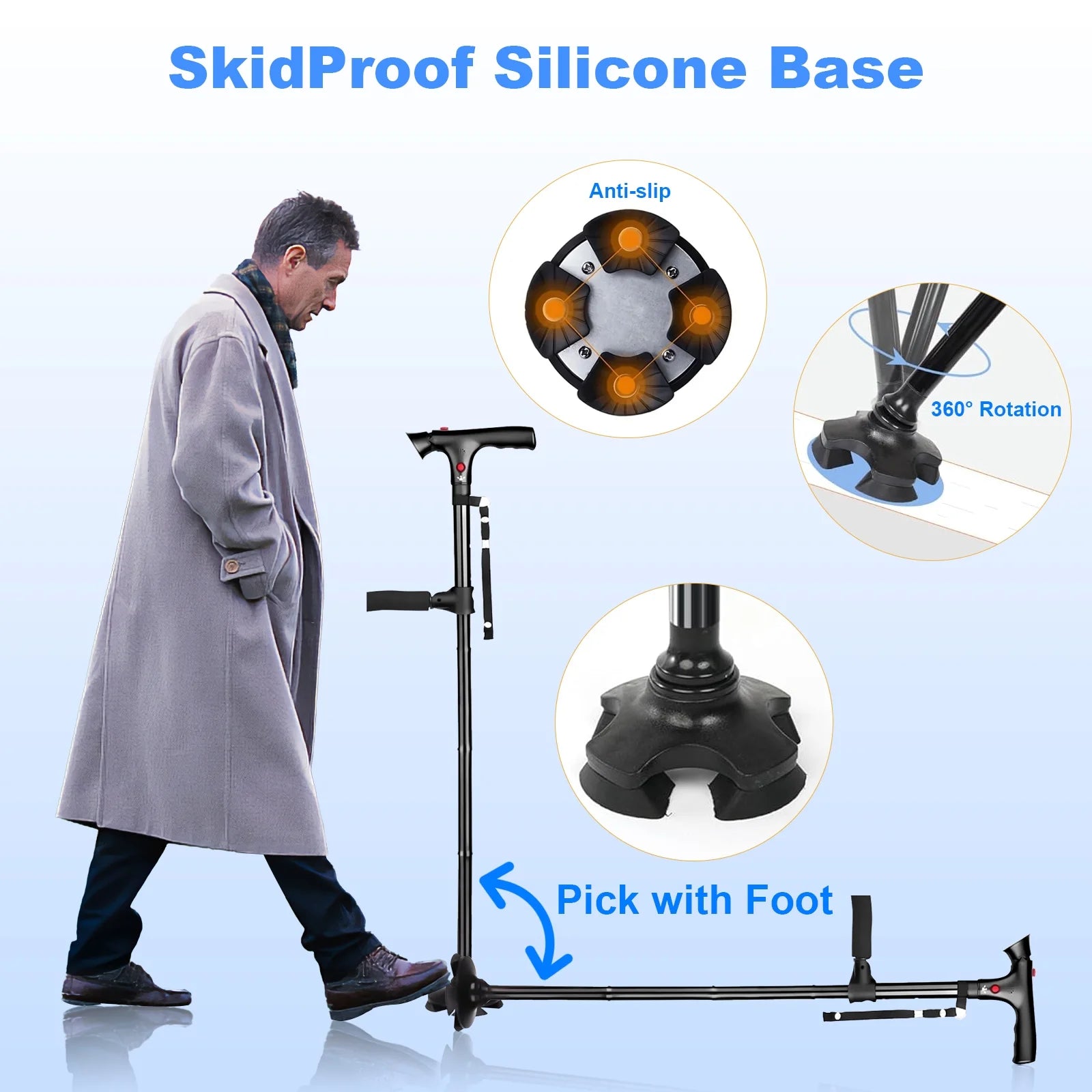 Equipped with an LED light for nighttime visibility and a safety alarm to alert others in case of an emergency, this walking stick ensures you stay safe in low-light conditions. -