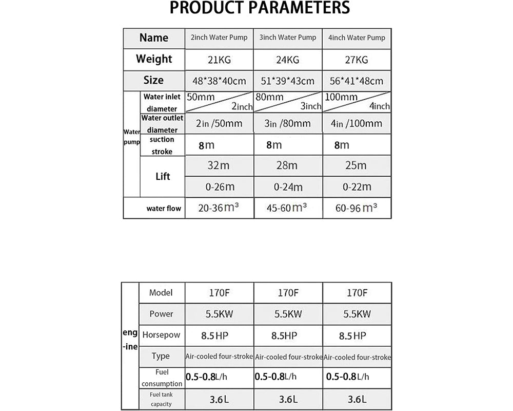 - Engine: 8.5HP, Air-Cooled Four-Stroke Water Pump