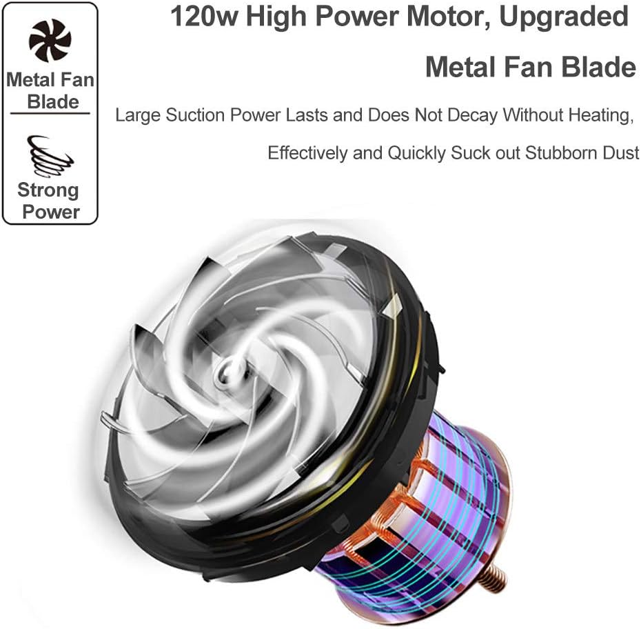 The 120W motor delivers up to 7000PA of suction, making it effective in picking up dust, crumbs, hair, and even liquid spills from rooms, sofas, carpets, and cars. -