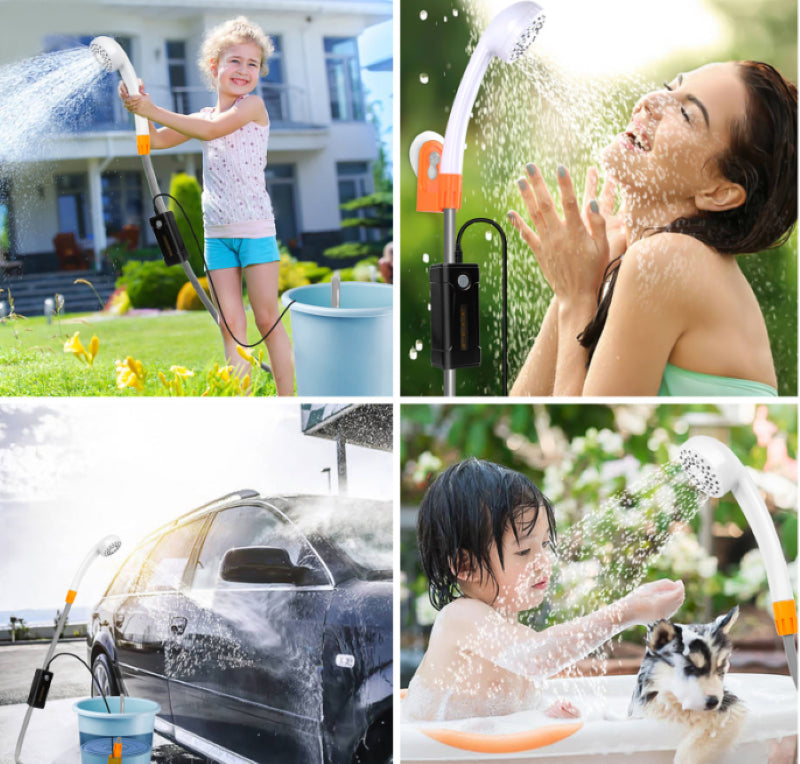 Our portable outdoor shower head features a 4400mAh USB rechargeable battery that can be charged with a USB Type-C connector (5V, 0.5-2A). The battery is separate from the pump, preventing water damage and extending its lifespan.