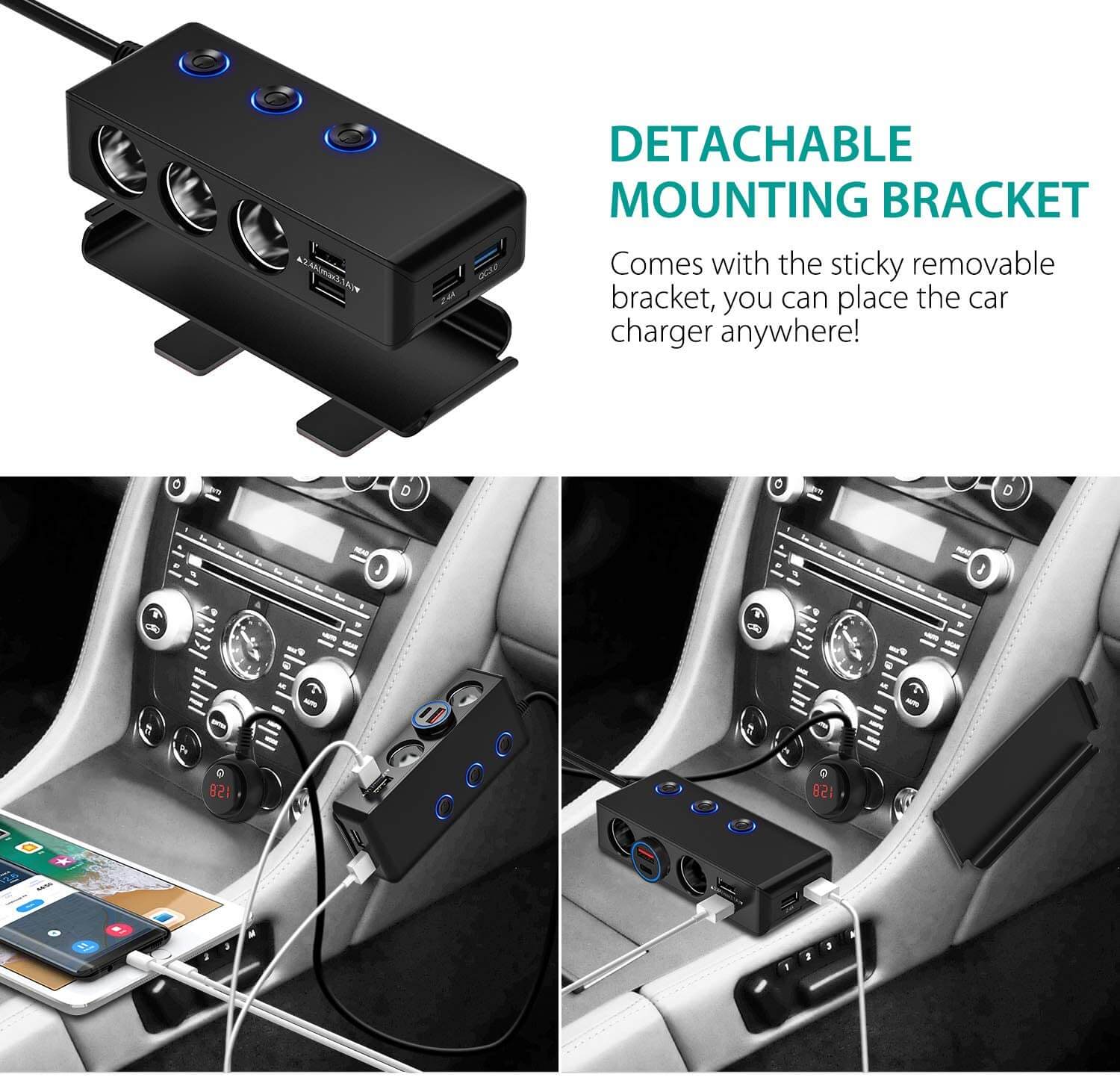 Improved Detachable Mounting Bracket: Includes a detachable mounting bracket for flexible placement in your vehicle. The 3.3ft extension power cord ensures rear seat accessibility, allowing passengers to charge devices comfortably.