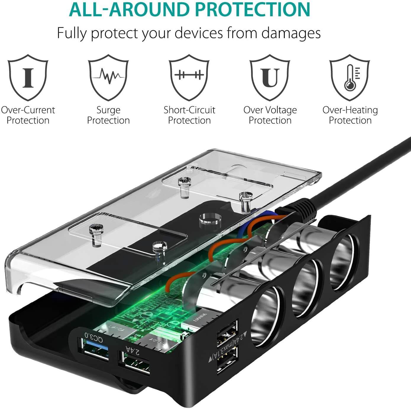 Quick Charge 3.0 Cigarette Lighter Adapter 120W, 12V/24V, 3-Socket Splitter with 8.5A DC Output