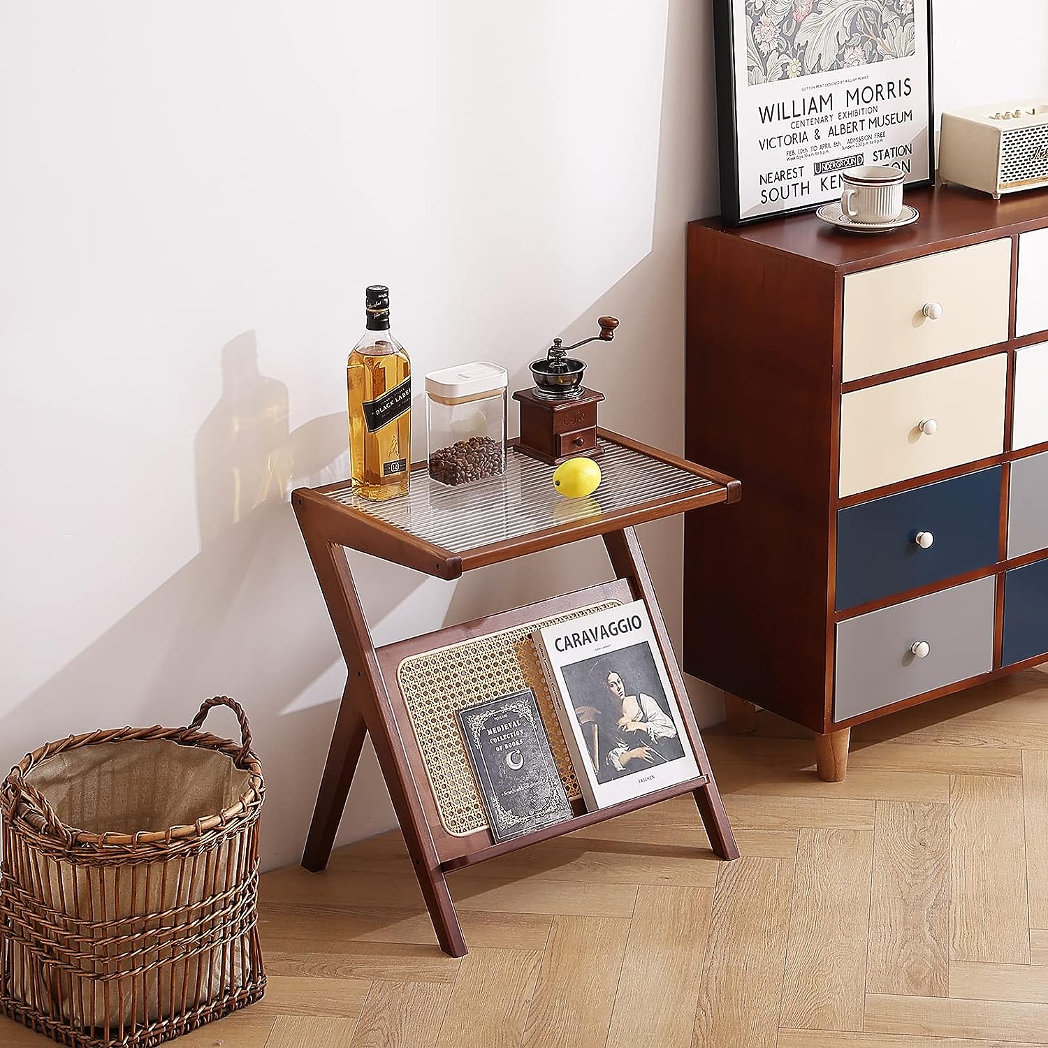 Rattan Side Table – Mid Century Nightstand with Bamboo Accent, Glass Coffee Tables for Small Spaces