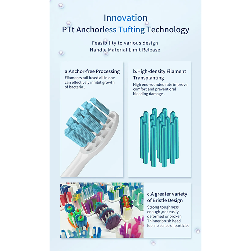 Upgrade your dental routine with our Anchorless Tufting Sonic Toothbrush Head HX664-P. Designed with cutting-edge anchorless tufting technology, this brush head leads the way to the future of oral hygiene. Experience unparalleled cleaning efficiency with DuPont filaments while ensuring optimal oral health with antibacterial properties.