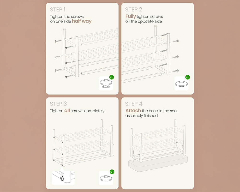 - Quick Assembly: Comes with all tools and clear instructions for fast setup of your Shoe Bench, Shoe Rack, or Storage Rack.