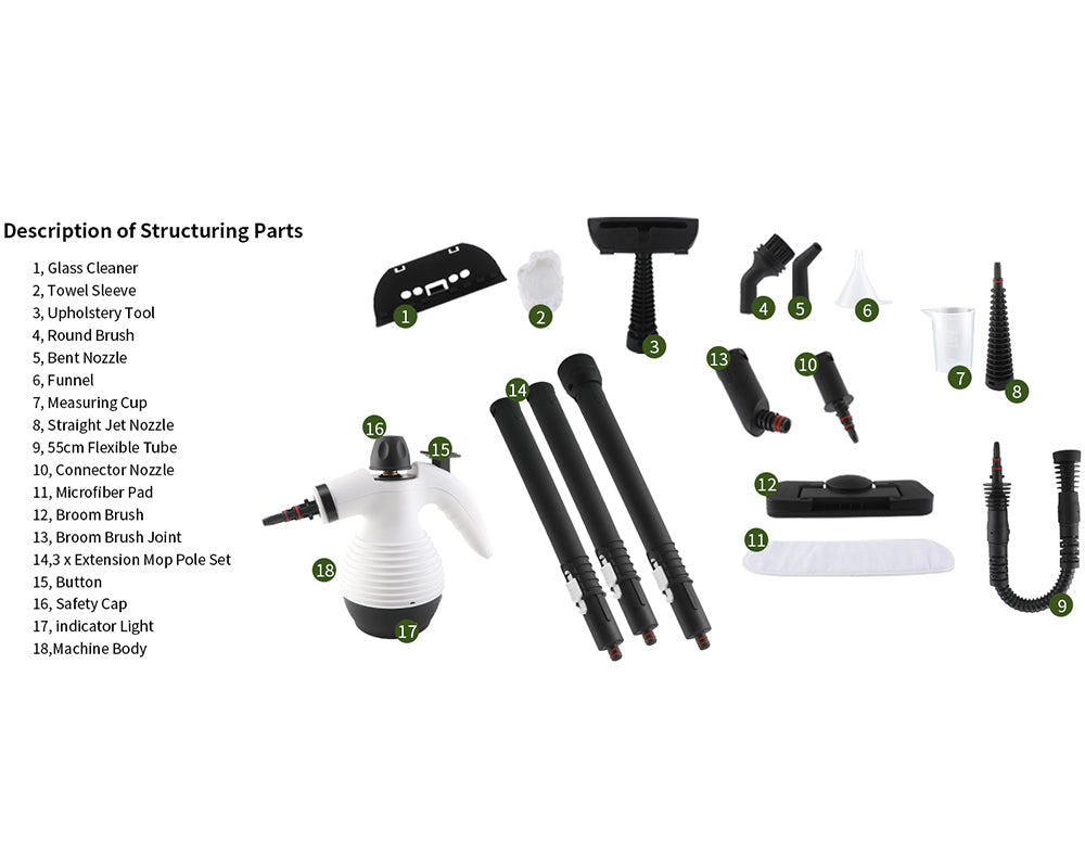 Multipurpose Steamer: The 16-piece accessory kit lets you clean hard-to-reach areas, corners, grout, upholstery, kitchen appliances, and more. The multipurpose steam cleaner ensures no surface is left uncleaned!