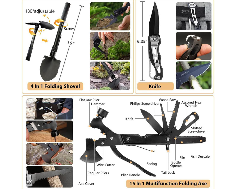 - Emergency Survival Kit Tools: Includes a multifunctional axe, Emergency Survival Kit Set folding shovel, emergency tent, fire starter, Emergency Survival Kit Set lantern, Emergency Survival Kit Set raincoat, and more.